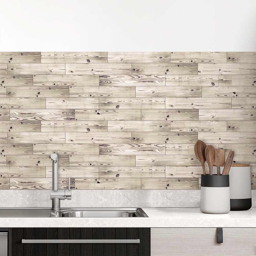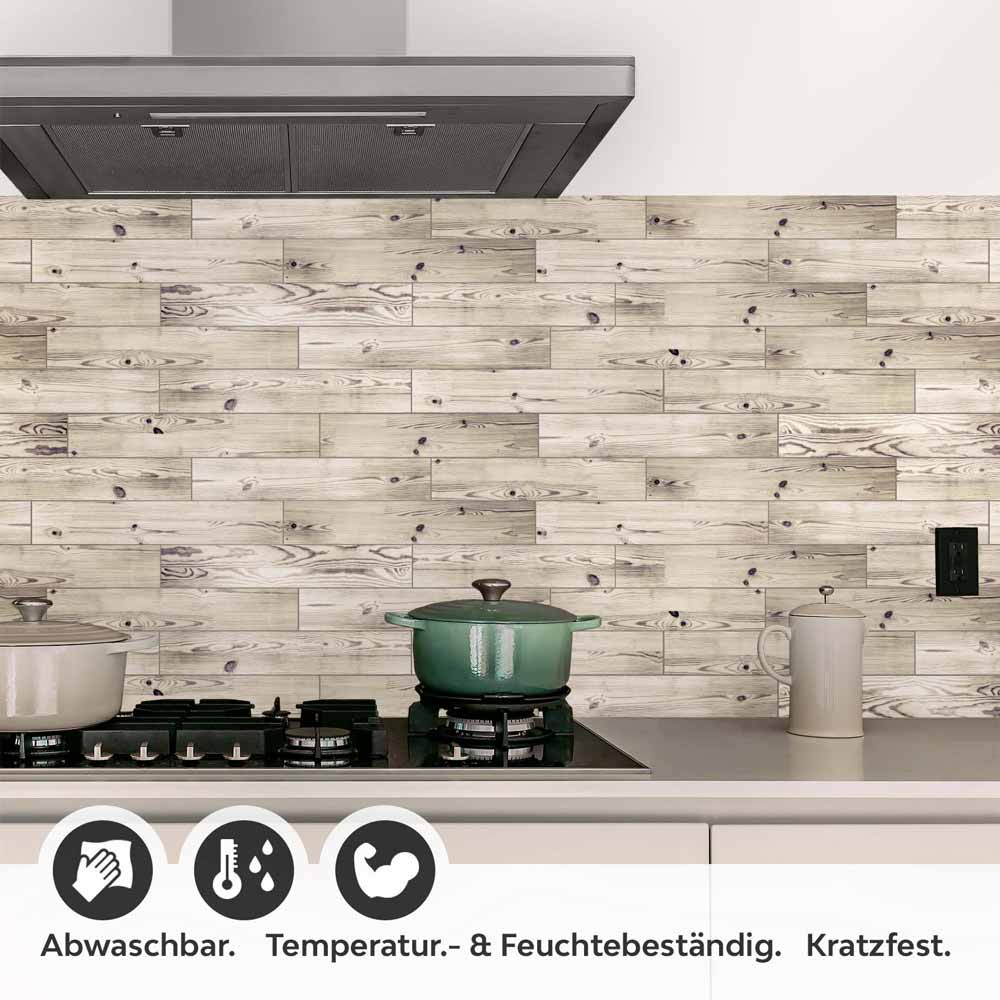 Die helle Holzoptik mit leicht verwitterten Details fügt sich nahtlos in verschiedenste Einrichtungsstile ein, von skandinavisch bis industriell. Neben ihrer optischen Raffinesse bietet die Folie praktischen Schutz vor Spritzern und Schmutz und sorgt für eine saubere, stilvolle Wandgestaltung.