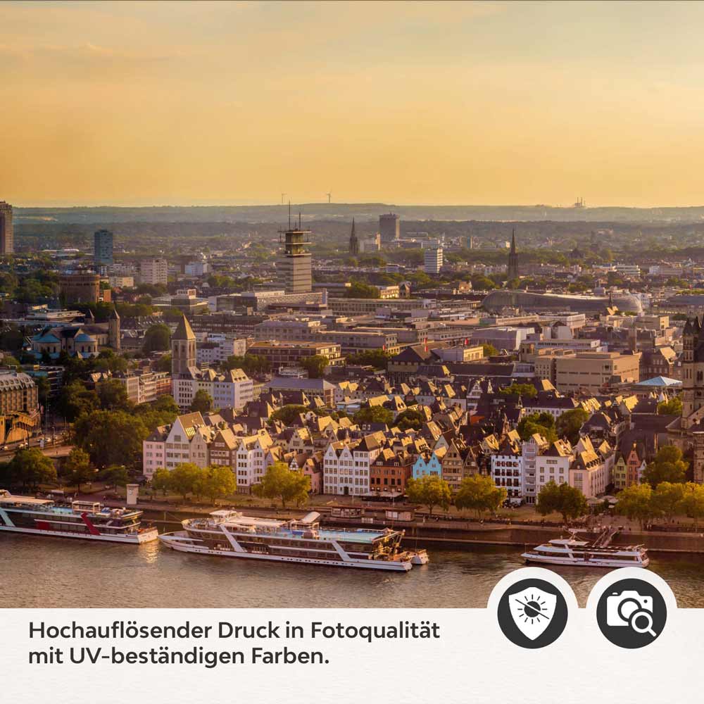 Der einzigartige Charme von Köln in Ihrer Küche! Die Küchenrückwand Folie Kölns Ufer im sanften Dämmerlicht zeigt die Stadt von ihrer schönsten Seite. Mit dem Dom als Wahrzeichen und der malerischen Rheinlandschaft entsteht ein eindrucksvolles Gesamtbild.