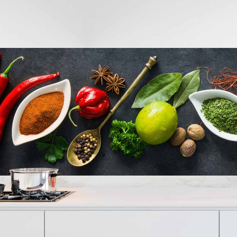 Ein Fest für die Sinne entfaltet sich direkt auf Ihrer Küchenwand: Die Küchenrückwand Folie Kräuter und Gewürze - Intensives Küchenflair vereint die Würze des Lebens in einer einzigartigen Komposition aus frischen Kräutern, kräftigen Farben und intensiven Gewürzen. Knackiges Grün von Basilikum und Rosmarin, das leuchtende Rot der Chilis und die erdigen Töne von Zimt und Kurkuma verleihen Ihrer Küche eine unverwechselbare Atmosphäre.