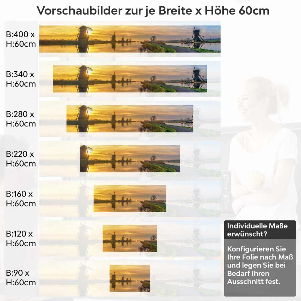 Erleben Sie mit der Küchenrückwand Folie Mühlenlandschaft am Wasser die Magie einer Landschaft, die Zeit und Raum überbrückt. Die historischen Windmühlen stehen majestätisch am Ufer, während die weichen Sonnenstrahlen den Horizont in ein leuchtendes Gold tauchen. Dieses Motiv ist pure Harmonie, die Ihre Küche in eine Oase der Ruhe verwandelt.