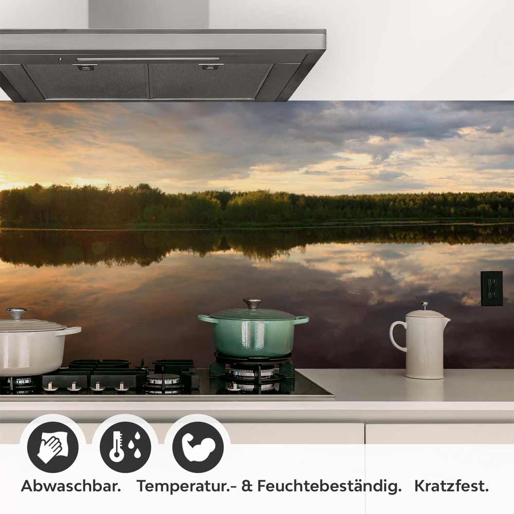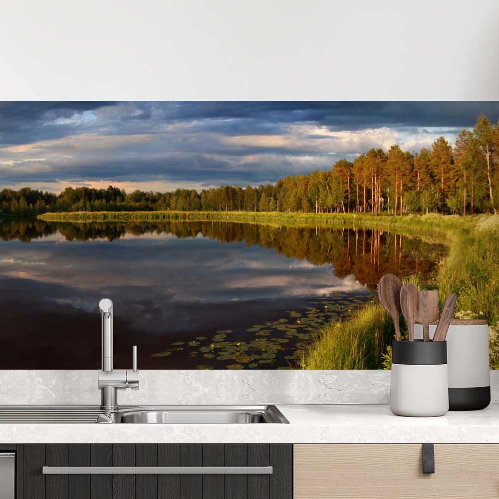 Mit der Küchenrückwand Folie Naturidylle mit See und Bäumen holen Sie sich die Essenz eines unberührten Paradieses direkt in Ihre Küche. Der See, dessen Oberfläche das Grün der Bäume und den weiten Himmel reflektiert, zieht alle Blicke auf sich und lässt den Alltag vergessen. Dieses Design vereint die Eleganz natürlicher Landschaften mit der Funktionalität einer modernen Küche – ein einzigartiges Highlight, das jeden Raum verwandelt.