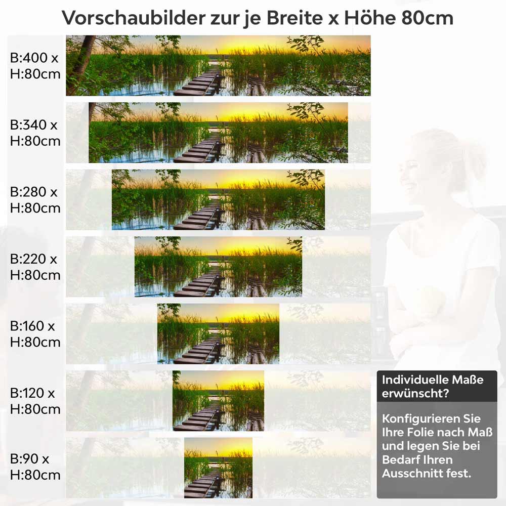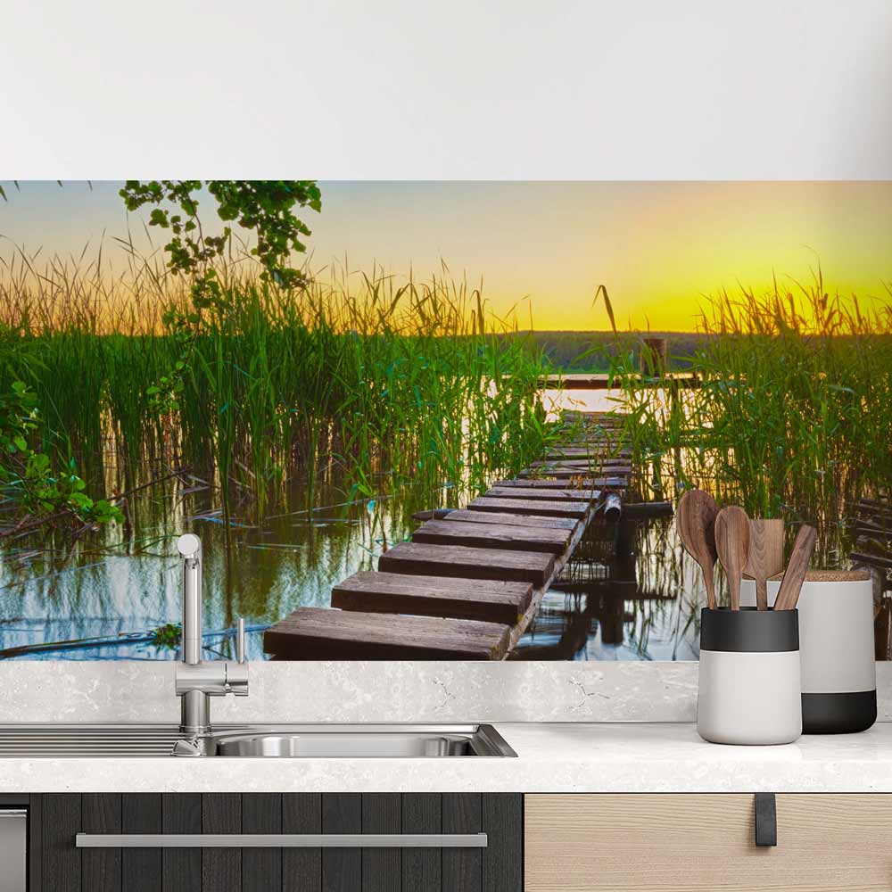 Mit der Küchenrückwand Folie Steg im Seeidylle wird Ihre Küche zum Schauplatz einer unvergesslichen Reise. Stellen Sie sich vor, Sie schreiten barfuß über einen alten Holzsteg, der sich wie ein Geheimweg durch das sanfte Grün des Schilfs schlängelt. Am Ende erwartet Sie der still glitzernde See, eingefasst von der Magie eines warmen Sonnenuntergangs. Diese Szene bringt nicht nur Ruhe, sondern auch Abenteuer in Ihren Alltag.