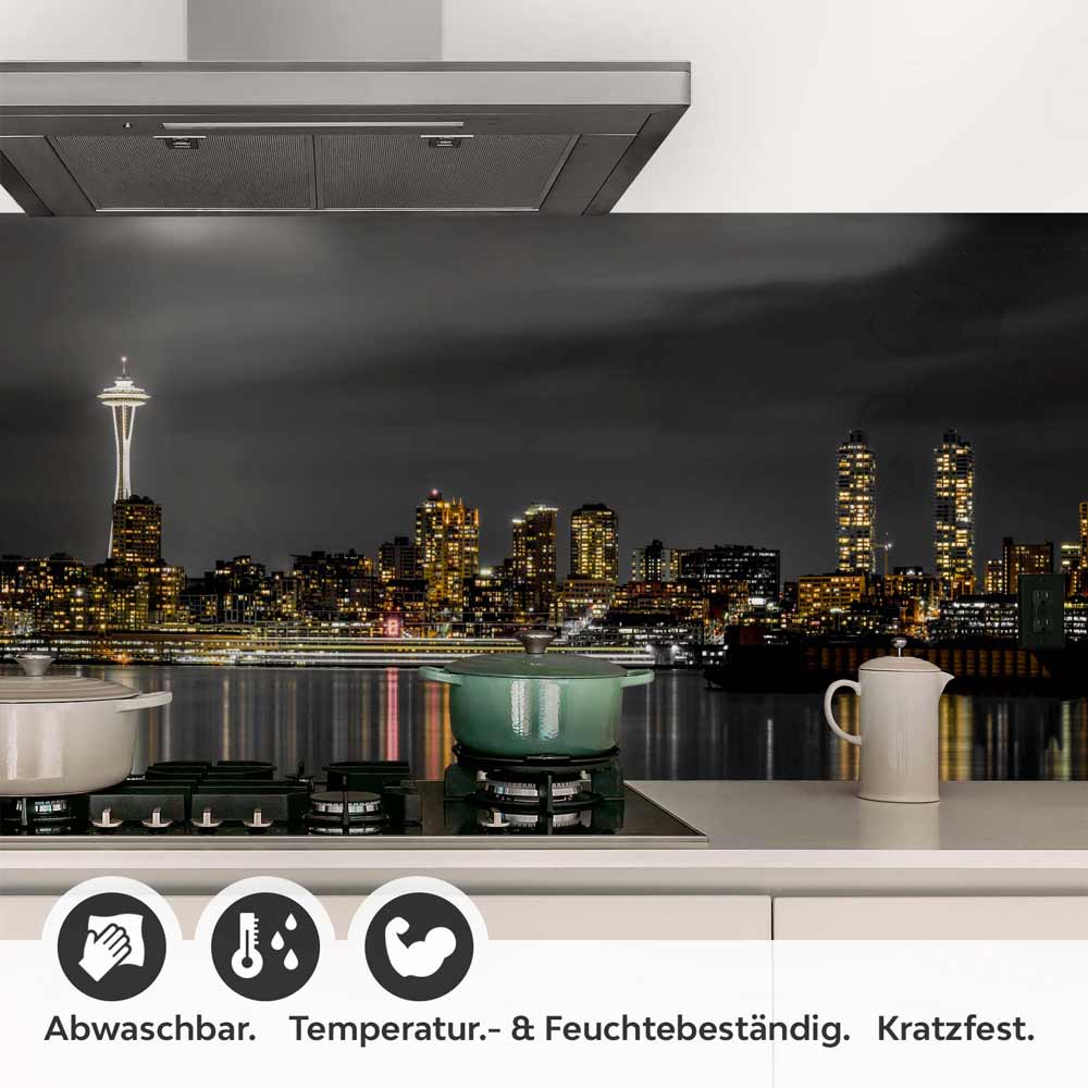 Die Magie der Stadt bei Nacht hält Einzug in Ihre Küche - mit der Küchenrückwand Folie Skyline-Lichter im Spiegel des Sees. Das kunstvolle Motiv kombiniert leuchtende Skylines und deren Reflexionen im Wasser zu einem atemberaubenden Blickfang.
