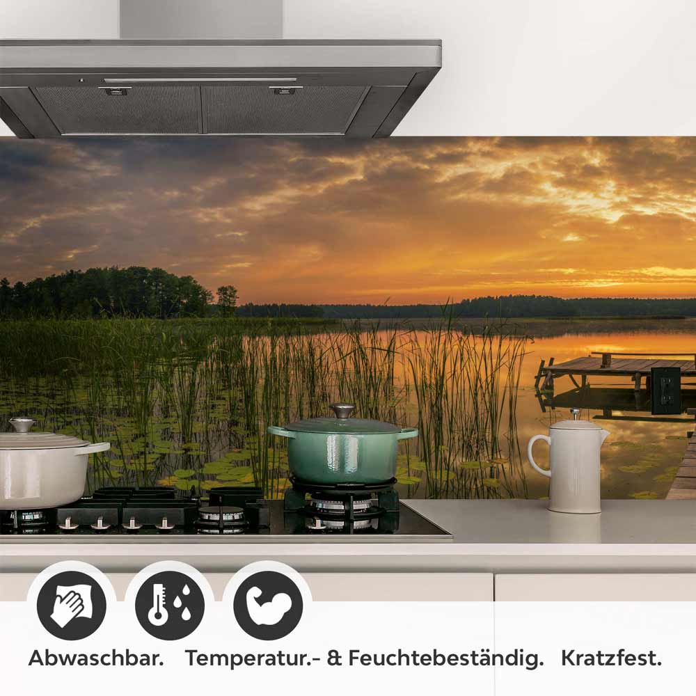 Stellen Sie sich vor, Sie starten Ihren Tag mit einem Blick auf die Küchenrückwand Folie Steg im See zum Sonnenuntergang - ein Anblick, der Sie augenblicklich in eine Welt der Ruhe entführt. Der hölzerne Steg, der sich in den goldenen Schein des Himmels zieht, vermittelt das Gefühl eines endlosen Horizonts und lädt Sie dazu ein, den Moment zu genießen. Diese Szenerie bringt einen Hauch von Magie in Ihre Küche.