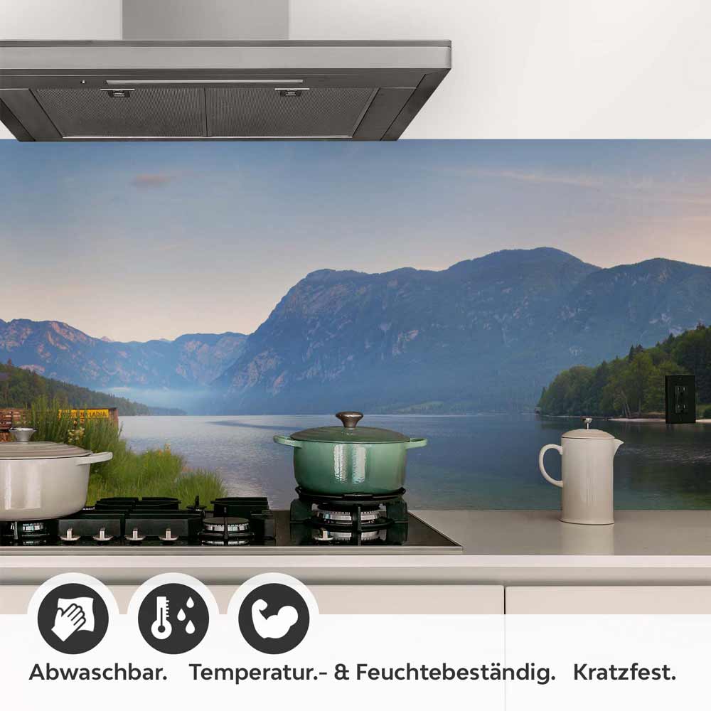 Erleben Sie mit der Küchenrückwand Folie Steinbrücke am See den Charme eines verträumten Naturparadieses in Ihrer Küche. Eine majestätische Steinbrücke erstreckt sich über das ruhige Wasser eines Sees, während die Berge im Hintergrund und der warme Sonnenuntergang die Szene abrunden. Es ist ein Motiv, das Geschichten erzählt und den Raum mit einer ganz besonderen Atmosphäre füllt.