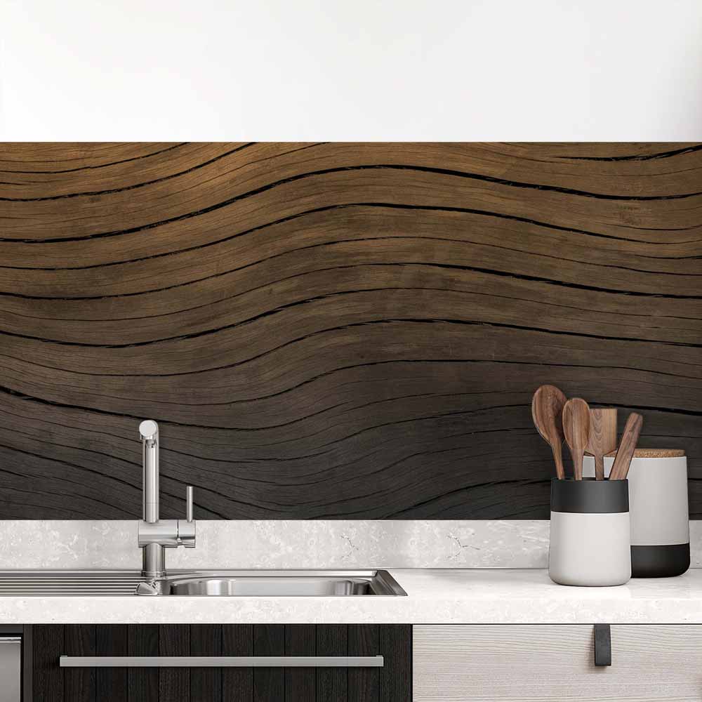 Mit der Küchenrückwand Folie Wellenholz Optik setzen Sie stilvolle Akzente in Ihrer Küche. Die organisch geschwungenen Holzmaserungen erinnern an die Bewegung von Wellen und verleihen Ihrer Küche eine einzigartige Dynamik. Diese Optik verbindet moderne Eleganz mit der Wärme natürlicher Materialien.