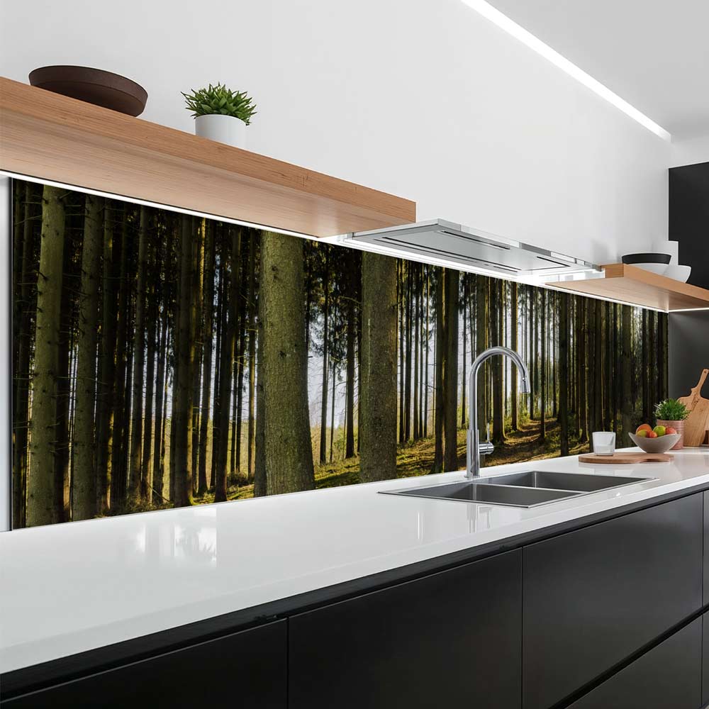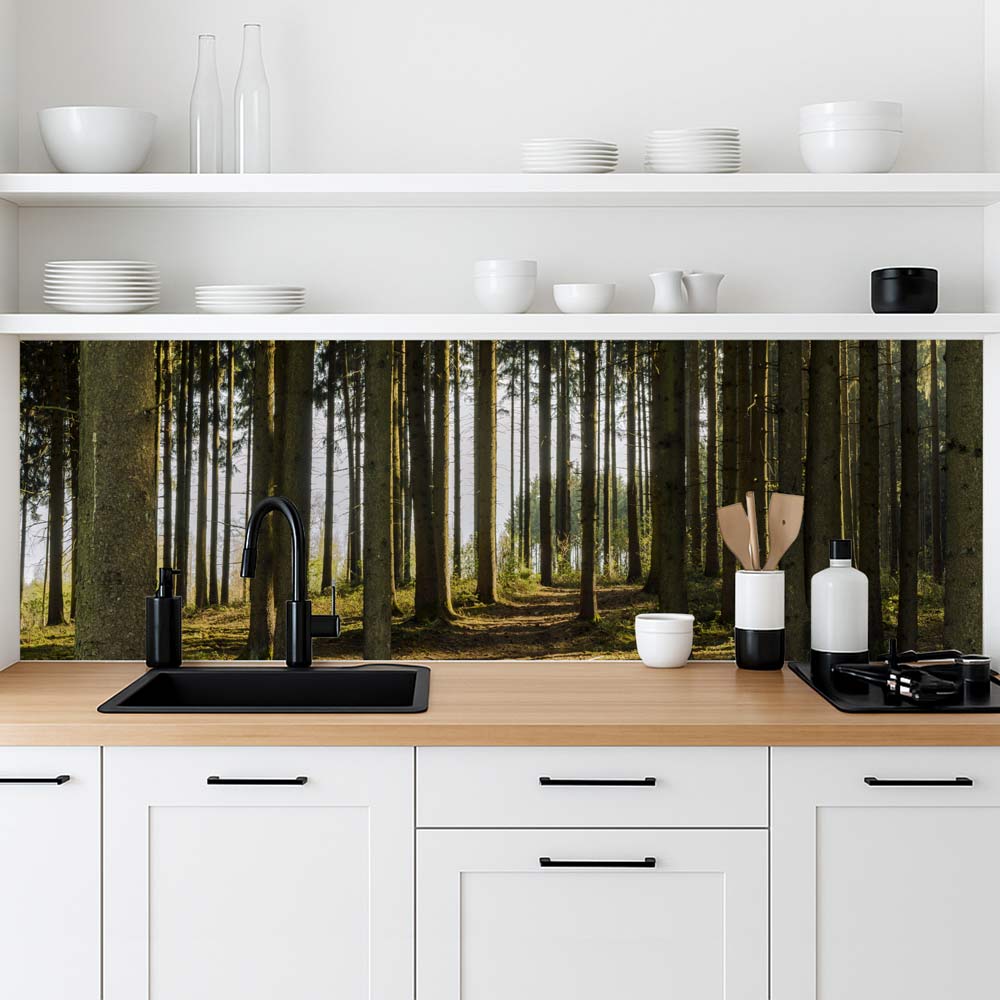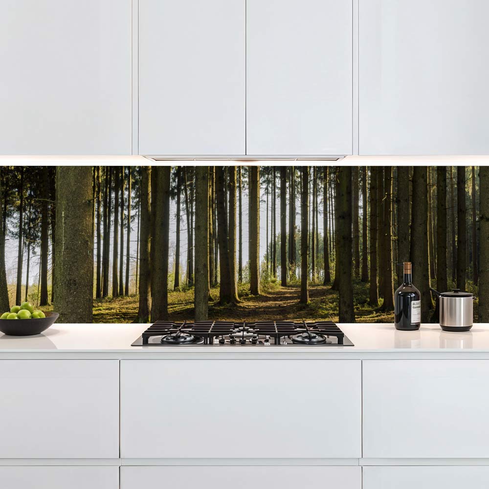 Küchenrückwand Platte Nadelwald im Lichtspiel der Natur