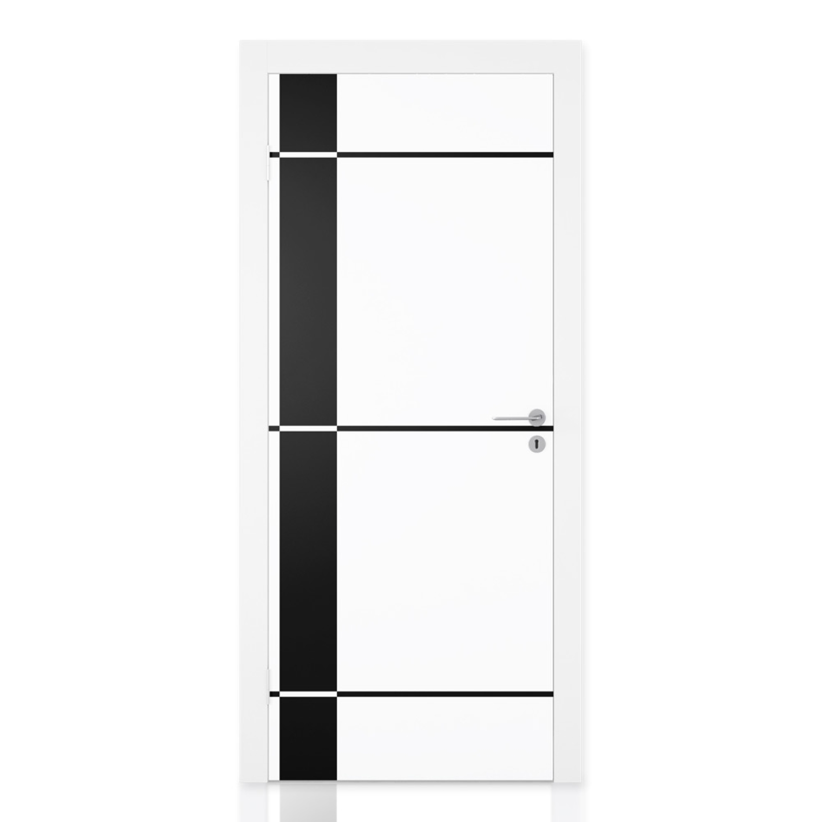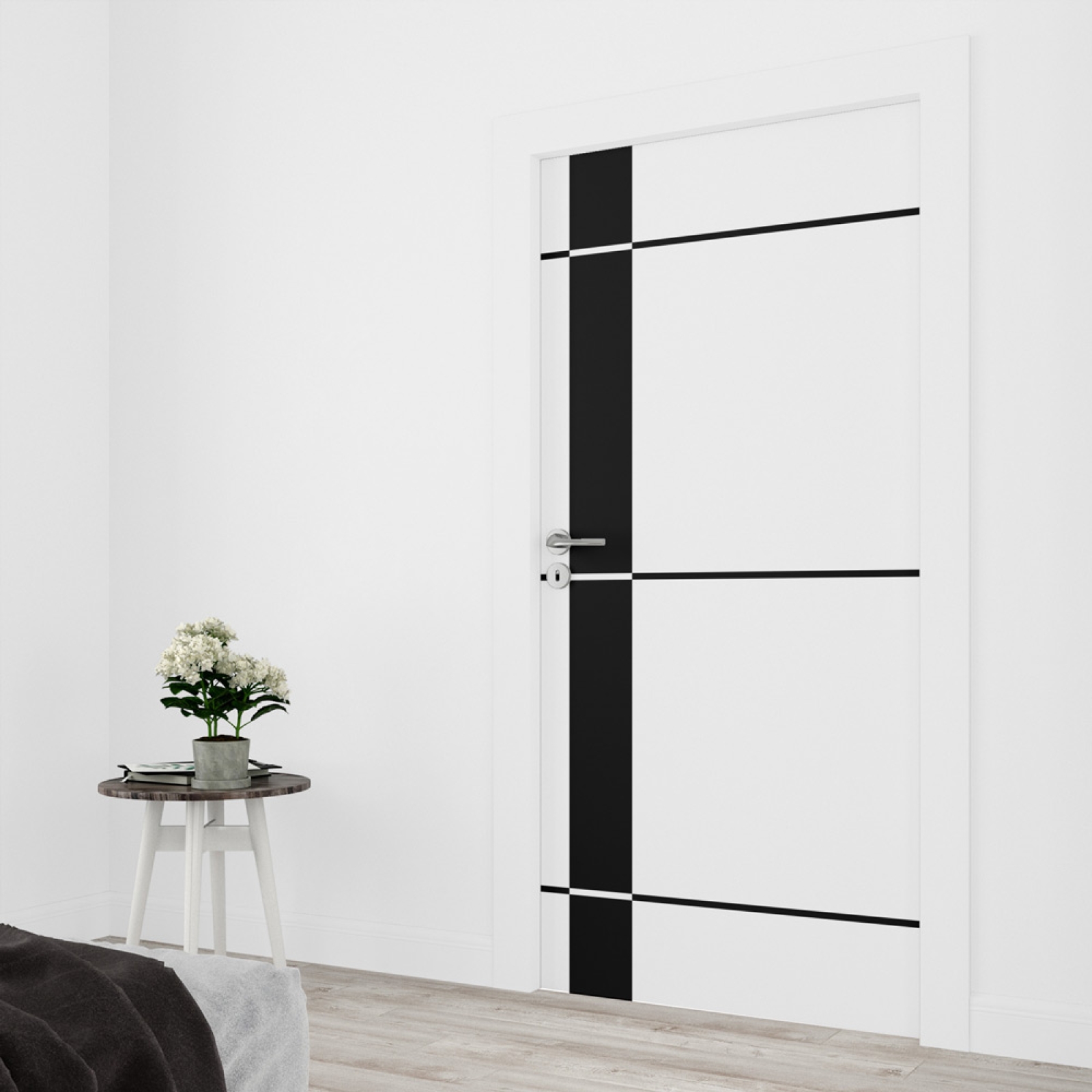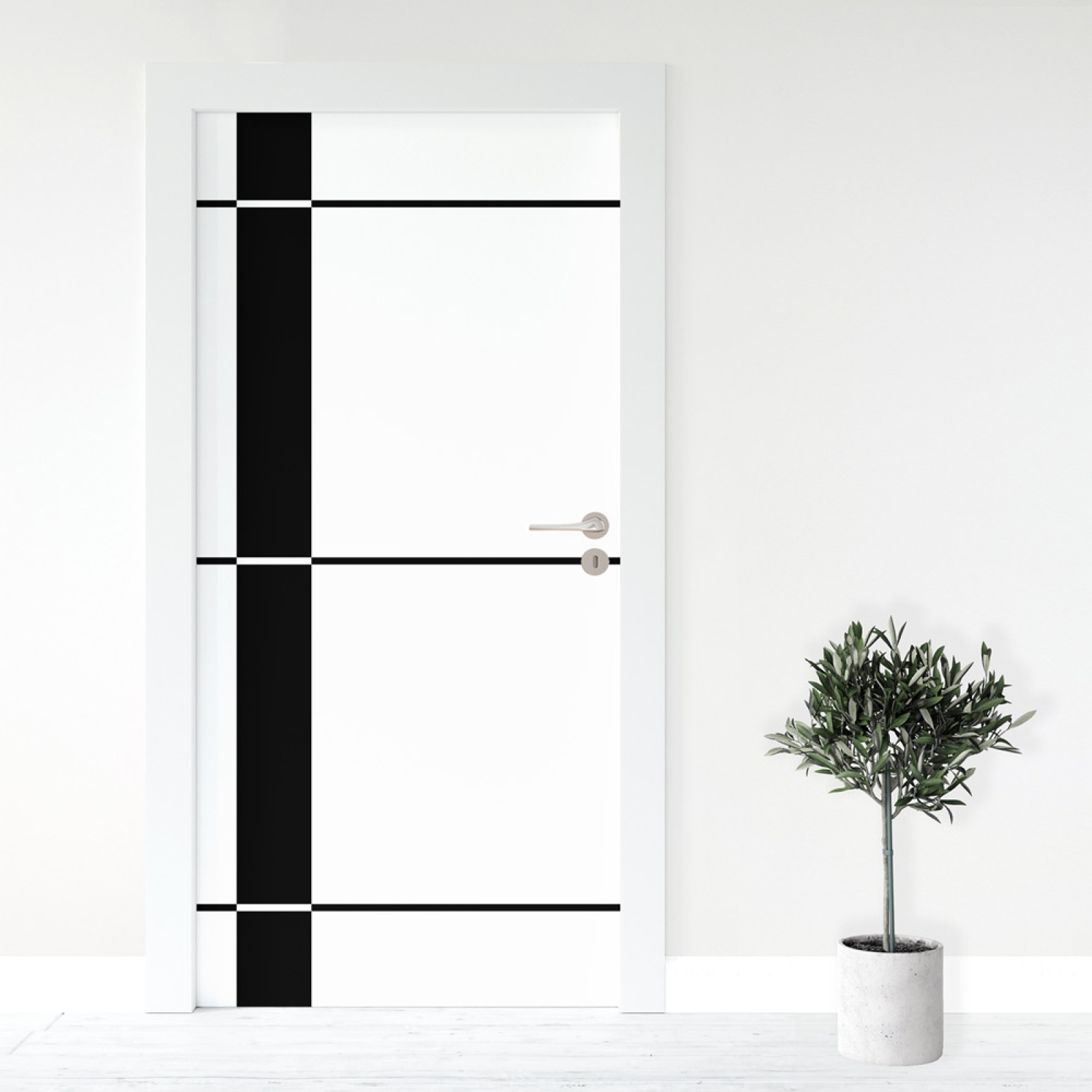 Modern, urban und stilvoll – die Türfolie Detroit setzt mit ihrem geometrischen Muster ein klares Design-Statement. Die markanten schwarzen Linien auf hellem Hintergrund erzeugen eine harmonische Balance aus Struktur und Minimalismus, inspiriert von der klaren Formsprache moderner Architektur.