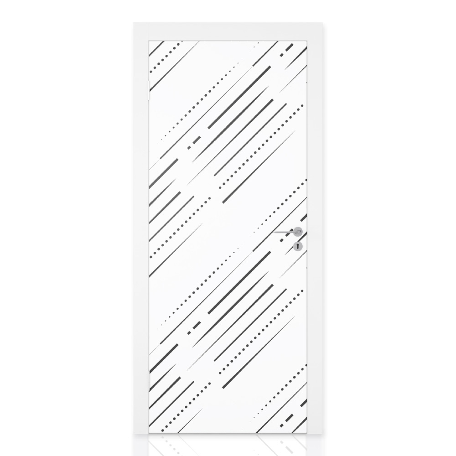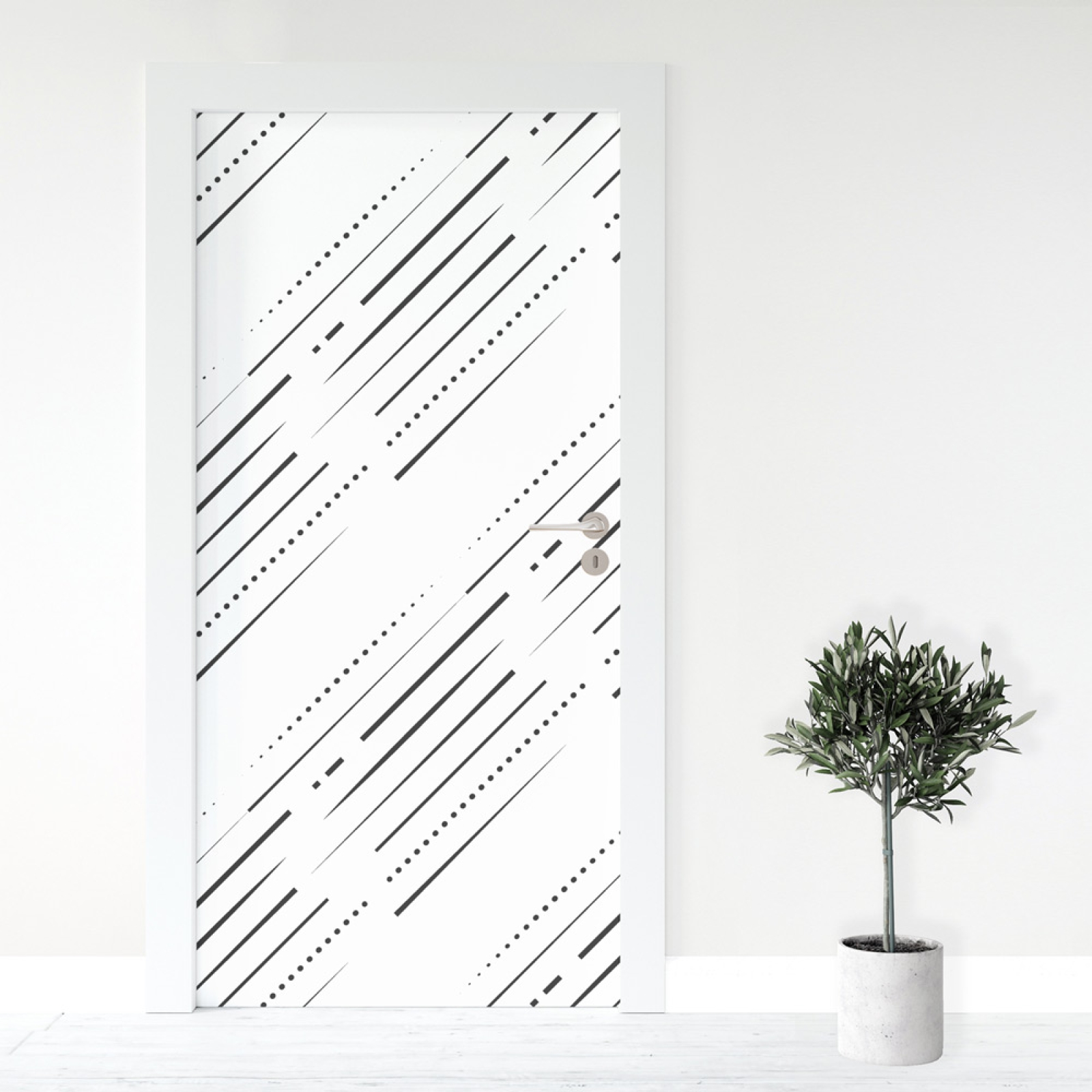 Mit der Türfolie gepunktete Linien bringen Sie moderne Dynamik in Ihre Räume. Das abstrakte Design aus filigranen Linien und punktierten Elementen verleiht Ihrer Tür eine stilvolle, futuristische Note. Die diagonale Anordnung sorgt für eine optische Bewegung, die Ihre Tür in einen echten Hingucker verwandelt.