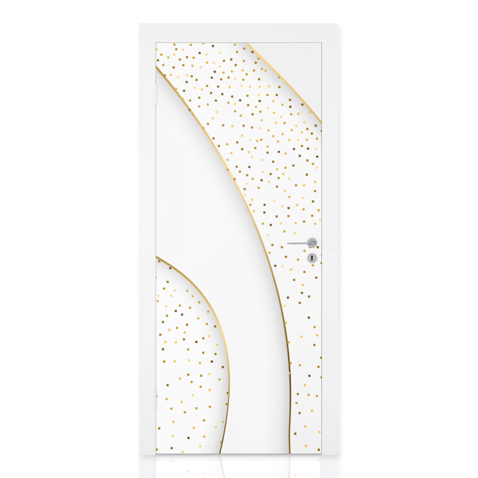 Mit der Türfolie Elegante Goldakzente setzen Sie elegante Akzente in Ihrem Zuhause. Das dezente Türbild kombiniert geschwungene Goldlinien mit einem feinen Konfetti‑Muster und verwandelt jede Fläche in ein stilvolles Highlight.