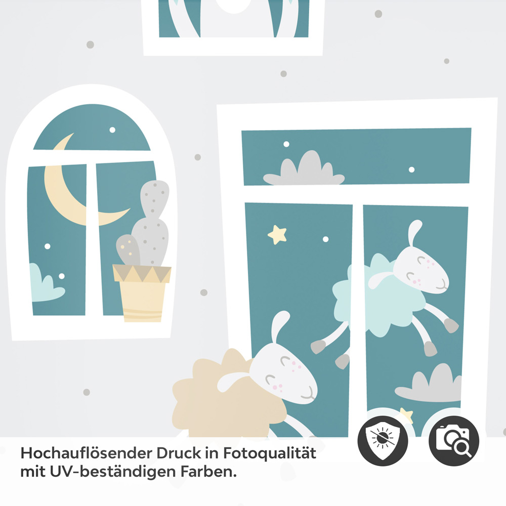 Ein sanfter Traum für kleine Schlafmützen – mit der Türfolie Kinderzimmer fliegende Schafe wird das Einschlafen zum Vergnügen. Verspielte Schafe schweben durch die Nacht, während der Mond freundlich vom Himmel lächelt. Die weichen Pastellfarben und das harmonische Design schaffen eine beruhigende Atmosphäre, die perfekt für eine entspannte Schlafenszeit ist.