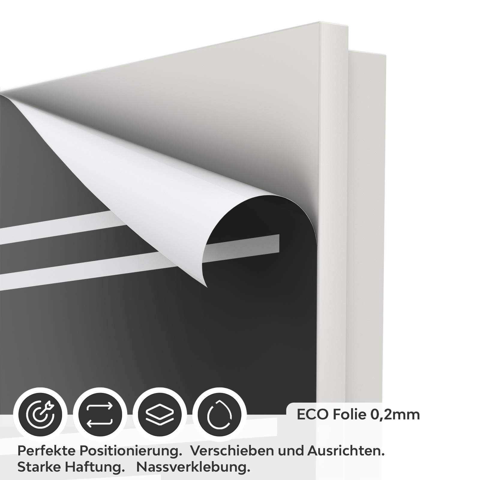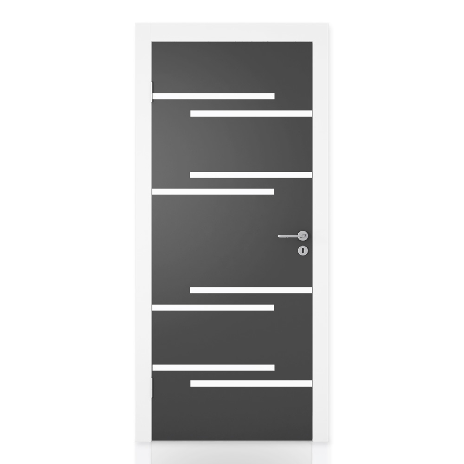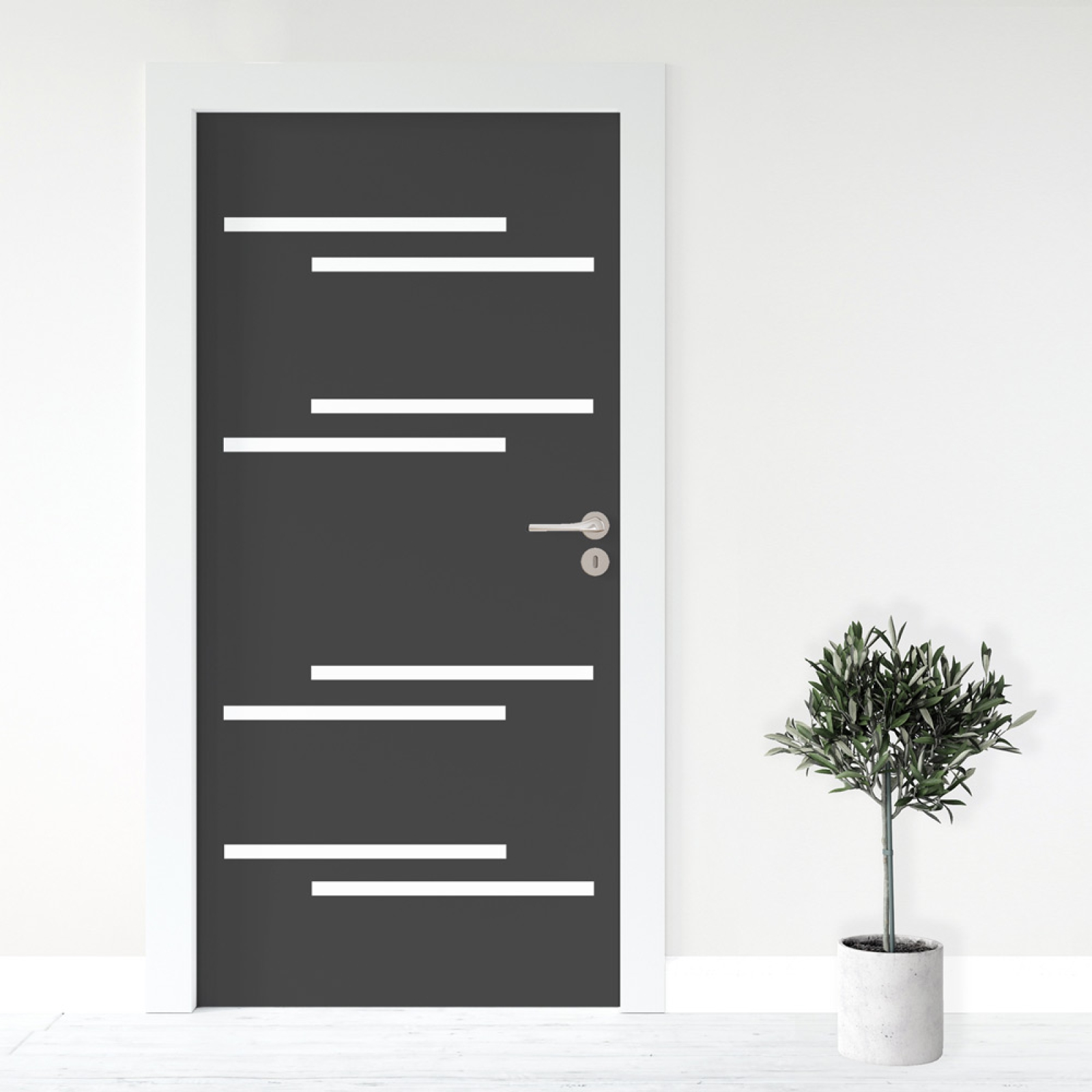 Modern und stilvoll – die Türfolie versetzte Linien setzt mit ihren weißen, horizontal angeordneten Streifen auf dunklem Hintergrund ein dezentes, aber kraftvolles Design-Statement. Die asymmetrische Anordnung erzeugt eine harmonische Dynamik, die perfekt in minimalistische, moderne Wohn- oder Arbeitsräume passt.